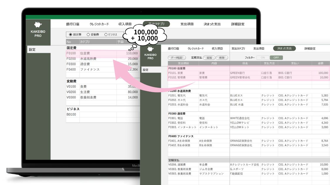 KAKEIBO PRO / LiGHTにおける固定費の予算設定は非常にシンプルです。「決まった支出設定」で登録した金額が、そのままそのカテゴリの予算として適用されます。例えば、家賃が10万円、管理費が1万円なら、住居費カテゴリの予算は11万円になります。