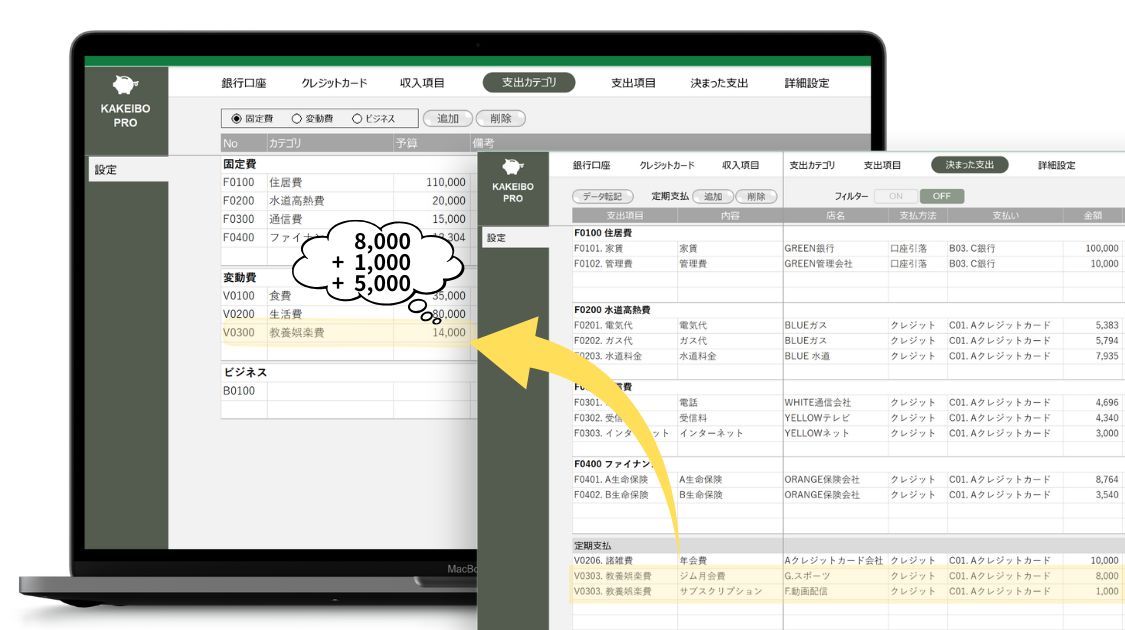 「決まった支出設定」に登録した金額は、KAKEIBO PRO / LiGHT上でそのまま予算作成のベースとして活用できます。固定費として登録したものは、その金額がそのまま固定費予算として計上できます。さらに重要なのが変動費の扱いです。例えば「娯楽費」の中で毎月1,000円のサブスクがあると登録しておけば、娯楽費の予算を立てる際に「最低でも1,000円は必要で、残りをどうするか」という視点で計画を立てられます。