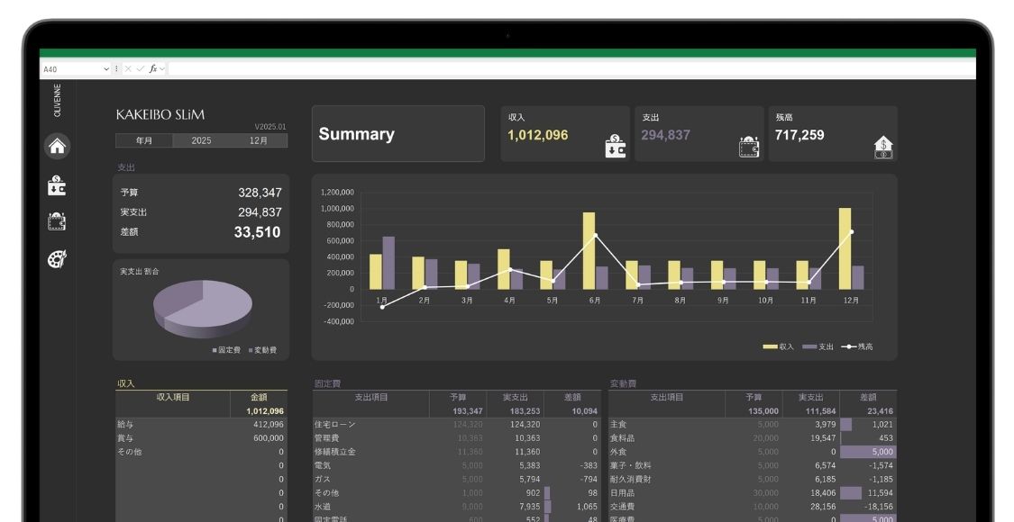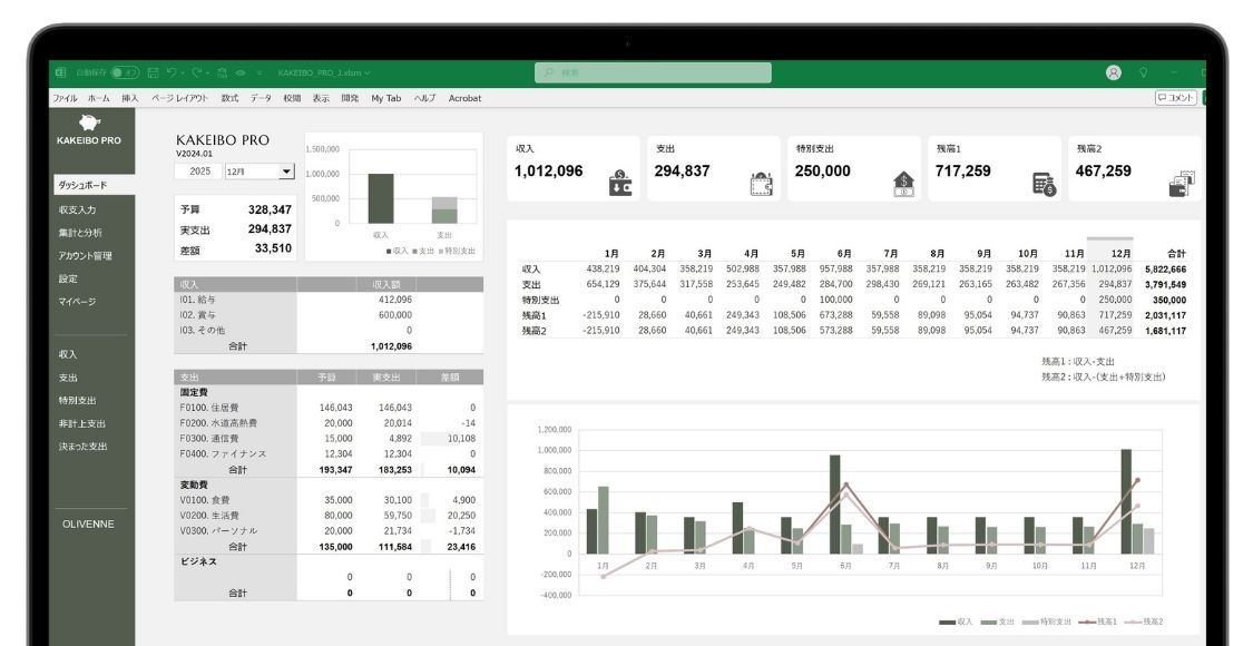 特に便利なのが、予算と実績の差額を視覚的に示すデータバー機能。どの費目が予算内に収まっているか、あるいはオーバーしているかが一目瞭然です。また、月ごとの収入・支出・特別支出・残高の推移をグラフで追えるトレンド追跡機能を使えば、年間を通した長期的な視点での家計改善戦略を立てることも可能になります。データに基づいた、一歩踏み込んだ家計管理を始めたい方にぴったりのツールです。